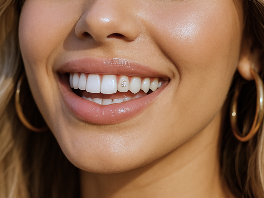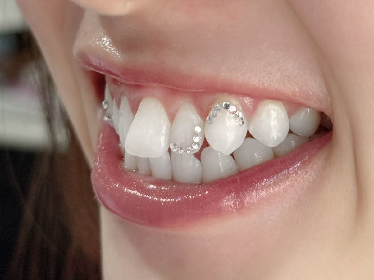 ネイルやピアスと同じように、歯に小さなクリスタルや宝石を装着して、個性を表現する歯のアクセサリー。